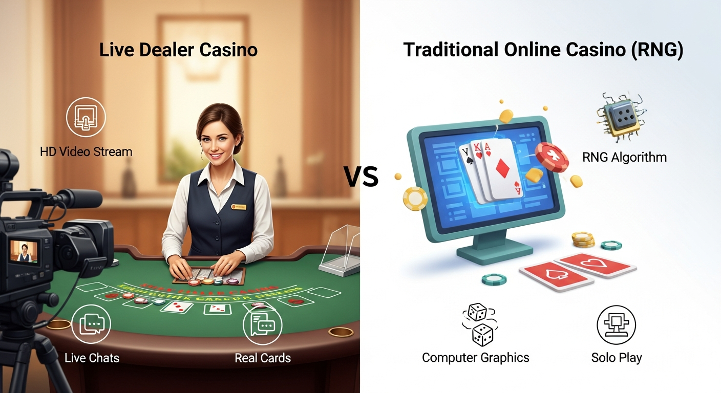 Key differences between the immersive, human-led Live Casino experience and the algorithm-driven Traditional Online Casino.